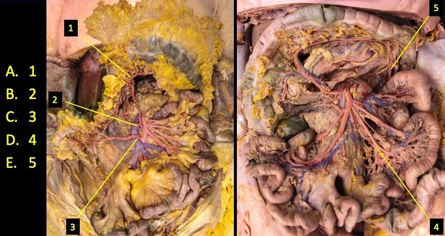Correct answer is D, a jejunal branch. The stem of the question request that you identify an artery that directly supplies the small bowels. The only option from the list is provided by the jejunal branch. All other branches supply the large intestines. As to the clinical scenario of this case, this patient is suffering from a small bowel obstruction (SBO). SBO’s in adults are most frequently caused by adhesions (i.e. from previous surgery), as exemplified by the patient’s well-healed surgical scar.