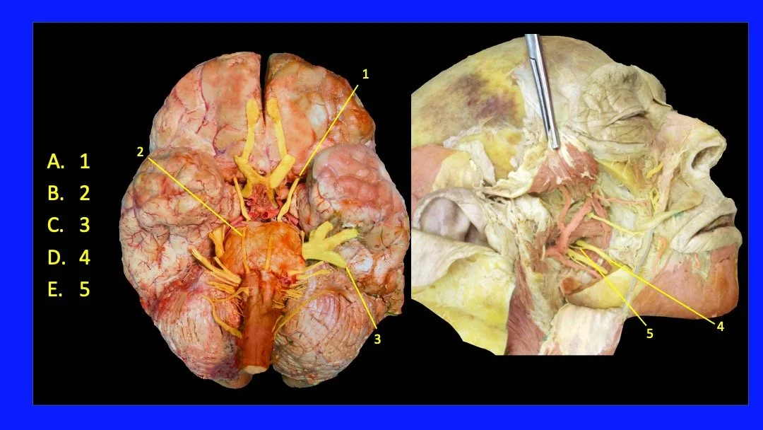 When Rodin began looking for a model to sit for his masterpiece, The Thinker, he asked one of his artist friends to pose. Rodin specifically requested that the artist think “deep thoughts”, but Rodin did not specify an exact pose that his amateur model should strike. He wanted him to come to a pensive pose naturally. After numerous weeks of trial and error, during which the “model” failed to place his fisted hand on his chin, Rodin grew frustrated. Rodin also noted that the model had grown quite frail, and would hardly eat much; he would spend lots of time chewing. Also, Rodin though the model’s mouth appeared to be open quite a bit on one side. Eventually, after a heated discussion, he fired his “model” friend and replaced him with a philosophy graduate student writing a dissertation on Shintoism. The philosophy graduate student naturally struck the desired pose and would even dine pensively (probably thinking of what food he might be able to afford to eat someday). Thus, he served as the ideal “model” for the now famous The Thinker. Forensic anatomists always suspected, however, that the original artist friend must have suffered a lesion to one of the nerves that precluded the model from adopting the pose. The “friend” would gaze into space, but would not place his hand, or even touch his chin as we often do when gazing off into space to ponder the social implication of the new Barbie movie. Which of the labeled nerves could be a candidate for the friend’s lack of sensation to his chin and the additional symptoms noted by Rodin?